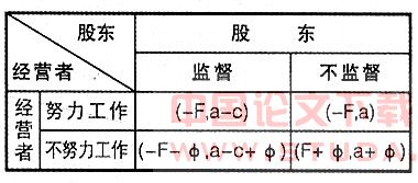 所以,所有者选择监督的概率一定要使经营者选择以股东权益最大化为目标和以自身利益最大化为目标的期望得益相等。可见,经营者不努力的成本φ越小,F/(F+φ)越大,(a+φ-c)/(a+φ)越小,即股东监督概率越大,所需要的监督也就越大。股东收益a越大,(a+φ-c)/(a+φ)越大,即经营者努力概率越大,股东所需要的监督也就越少。股东监督成本c越小,(a+φ-c)/(a+φ)越大,即经营者努力概率越大,股东所需要的监督也就越少。