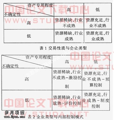 交易成本经济学中关于交易的两个属性,资产专用程度和不确定性可以用来分析企业的交易特点,进而判断企业应当采用的内部控制模式。但是,资产专用程度和不确定性只是理论框架中比较抽象的概念,在具体实务中的操作性较差。为此,我们分别选择企业资源的稀缺程度(或者容易获得程度)和所处行业的成熟水平作为替代指标。稀缺程度越高,资源向其他企业流动的可能性越大,企业失去资源所造成的损失也越大,即资产的专用程度越高;反之亦然。而行业成熟度越高,企业所处环境的可预测性越强,业绩也越容易进行判断,即交易不确定性低;反之亦然。根据交易的属性不同,企业可以被划分为四种类型,见表1。
