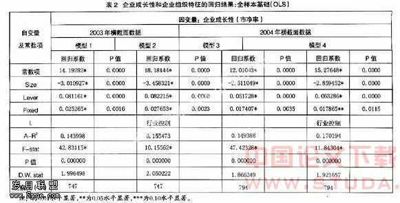 本文根据基本计量模型(1),运用OLS方法估计了各项企业组织特征对企业成长性的影响程度及其方向(回归结果见表2)。