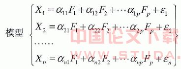 称为因子模型,模型的矩阵形式为X=AF+?着,模型中的F1,F2,…FP称为公共因子,它们是相互独立的;?着1,?着2,…?着n称为特殊因子,是对应于向量Y的分量Y1,Y2,…Yn所特有的因子,它们也是相互独立的,且与向量F独立;矩阵A中的元素αij称为因子载荷。找出公共因子,就是采用某种方法找出因子载荷阵。