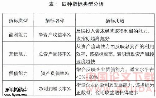 为综合反映评价科技型企业的收益质量,在选取指标时,应兼顾盈利能力、营运能力、负债水平及发展能力等各种指标,指标的选择必须要具有意义,具有可测量性、可控性和实用性,主要选取净资产收益率(X1)、总资产周转率(X2)、资产负债率(X3)和净利润增长率(X4)四个指标作为评价指标,分别表示影响企业的盈利能力、营运能力、偿债能力和发展能力,如表1所示。