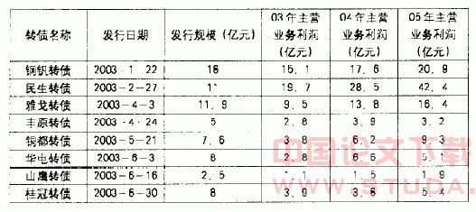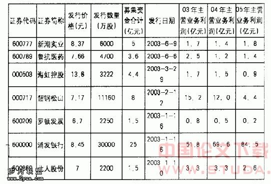 选取2003年上半年发行债转股的和增发新股的所有上市公司的有关财务数据,见表2和表3。我们用2004年和2005年的算术平均主营业务利润相对于2003年的主营业务利润的增长量表示△β,用债券(股票)的融资总额表示△I,由此得出7家发行新股的上市公司的平均投资效率σ1=-12.3%,同理得出8家发行债券的上市公司的平均投资效率σ2=59.5%