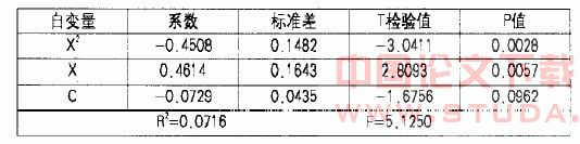 表1中虽然拟合优度R2较低,但t检验和F检验很好,说明净资产收益率与负债率的上述二次曲线关系是很明显的,故净资产收益率与负债率的二次曲线。关系式为: