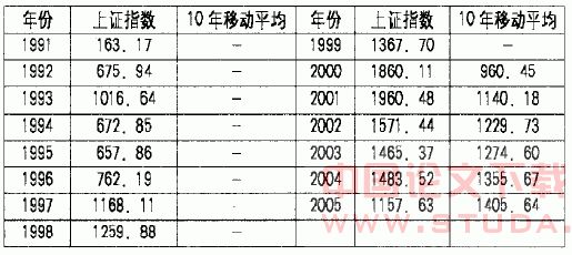 为了得出股权融资的资本增值成本,我们选取上证指数1991年~2005年每年的最后一个交易日的年线值作为当年各种股票的平均市场价值,进而得出上证指数10年平均移动趋势值,平均每年趋势增长率为6.61%(采用几何法计算,见表7),该趋势增长率可以近似表示企业股权融资的资本增值成本。
