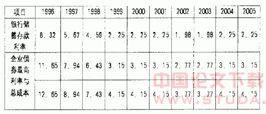 注: (1)资料来源:中国债券网。 (2)各年份的利率为该年不同时期利率的算术平均值, 企业债券利率= 银行储蓄存款×140%; 企业债券总成本=企业债券利率+1%。