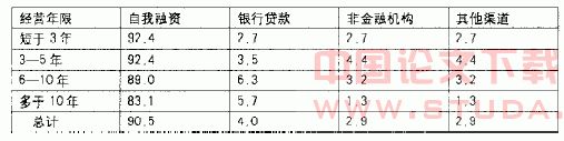 由该图我们不难看出:(1)虽然随着民营中小企业的不断成长自我融资的比例有所下降,但其比例仍在90%以上。(2)在民营中小企业发展的初期也是其资金最缺乏的阶段其非金融机构融资的比例高于或等于银行贷款的比例,这说明商业银行在对民营中小企业的支持力度还远远不够。(3)除自我融资和银行贷款外其他的融资渠道相对较少,比例总计不超过3%。