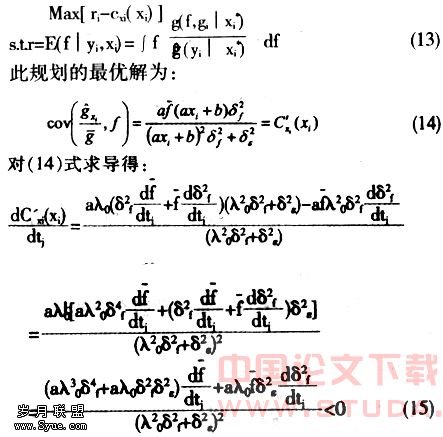 依据假设,欧盟竞争政策对欧盟企业的激励的规划条件为:其中g(f,g|x*)为给定激励下,欧盟企业的能力f和产出水平y的联合分布密度,x*表示均衡的行动激励。E(f|y,x*)表示均衡产出和行动激励的代理人企业的报酬水平。所以,代理人欧盟企业选择激励x以最大化其效用: