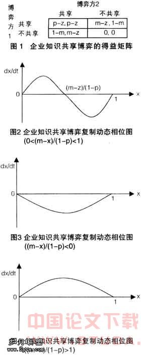 2.行为策略。博弈方都有两种行为方式:共享;不共享。如果他们的知识都不愿共享,相互封锁,那么个人的知识就会出现低水平重复,使他们各自获得的利益不多,假设为0收益;如果有一个企业成员打破常规,进行知识共享,那么他就获得m(0.5<m<1)机会,但共享者是有学习成本z的;如果他们的知识都实行共享,就会获得更多的发展机会p(m<p<1),此时各有学习成本z。