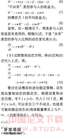 对于企业知识共享机制问题,可以用博弈理论进行研究。目前,国内一些研究已对此做出了初步的探索,如用“囚徒困境”模型解释不愿知识共享的问题,但是这些分析研究均是应用经典博弈理论进行分析。经典博弈理论从博弈方的完全理性出发,在信息充分的前提下找到了博弈的均衡解。然而对现实中的决策行为者来说,完全理性是很难满足的高要求。当社会环境和决策问题较复杂时,人的理性局限是非常明显的。因此要保证博弈分析的理论和应用价值,必须对有理性局限的博弈方之间的博弈进行分析,进化博弈论从有限理性的个体出发,以群体行为为研究对象,合理解释了生物行为的进化过程。生物进化中生物性状和行为特征动态变化过程的“复制动态”,在有限理性博弈分析中正是模拟有限理性博弈方学习博弈和调整策略过程最主要的动态机制之一,而生物进化理论中具有在动态调整过程中达到,在受到少量干扰后仍能“恢复”的稳健性均衡概念“进化稳定策略”,正是有限理性博弈分析最核心的均衡概念,或者说动态策略稳定性概念。