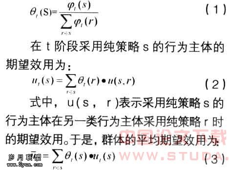 假定两类行为主体均采用纯策略,令S是行为主体所有纯策略的集合,(S)代表所有在t阶段采用纯策略s∈S的行为主体集合,定义状态变量θt(S)表示在t阶段采用纯策略 s的行为主体的群体比例向量,于是有: