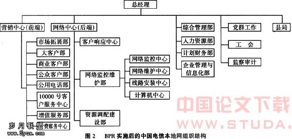 与BPR实施前相比,新的本地网组织结构显示了典型的前后端型高层组织结构的特点:
