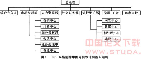 中国电信集团公司作为我国特大型通信运营商,其组织结构从集团公司到县一级营业厅,采取的是按行政区划设置的层级式结构,但其本地网(即同一长途编号区的电信网)作为基本运营单元,几乎集中了电信运营企业的所有特征,中国电信的组织结构可以看成是多个本地网组成的体系。因此,中国电信的业务流程再造和组织结构创新主要是本地网的变革。