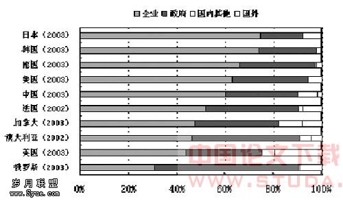 技术创新投入主体的错位,只会挫伤企业长期技术创新能力的,损伤高新技术产业的长期健康发展。2003 年,我国的 R&D 经费支出总额中来自企业的资金占 60.1% ,来自政府的资金占 29.9% ,其他方面的资金占 10% ,企业已经成为我国 R&D 活动的投入主体。企业不但是我国 R&D 经费的最大来源,同时也是 R&D 活动的主要执行部门,其在我国 R&D 活动中的主体地位已经确立。国际方面的数据也说明这一点,2003 年大多数发达国家企业 R&D 经费占全部 R&D 经费的比重都在 60% 以上。