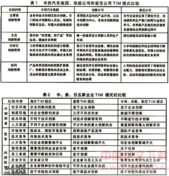 日本三家优秀企业TIM模式的相同点为:在集团外部,都和企业外部创新保持强联系;在集团内部,都有对创新高度市场化导向的支持体制;在项目层次,高级管理层对创新的介入都很强。具体的比较如表1所示。在表2中,笔者还将日本丰田、佳能、索尼三家企业的TIM模式与海尔集团和美国惠普公司的TIM模式进行了比较。