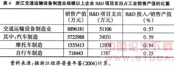 从规模以上企业新产品产值占总产值的比重这一反映企业新产品开发情况的指标看,浙江交通运输设备制造业这一比重只有17.10%,特别是其中的汽车制造、自行车制造这一比重分别仅为15.04和14.13%(见表1),这表明浙江汽车和自行车制造业的新产品开发力度相对不足。