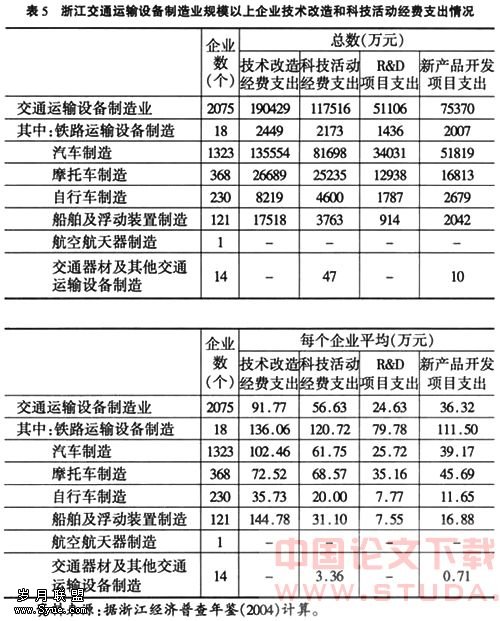 表5则从另一角度反映了浙江运输制造业技术改造和科技活动经费投入不足问题。浙江规模以上交通运输制造业的技术改造经费支出、科技活动经费支出、R&D项目支出、新产品开发项目支出分别为19.04亿元、11.75亿元、5.11亿元和7.54亿元,每个企业平均只有91.77万元、56.63万元、24.63万元和36.32万元。对于交通运输设备制造业这种需要高强度技术创新投入的行业来说,这样的投入水平是远远不够的。科技人员极其匮乏,再加上技术改造和科技活动经费投入严重不足,致使浙江交通运输制造业对引进技术的消化、吸收与创新不足,同时也严重影响了企业自主创新能力的提高。