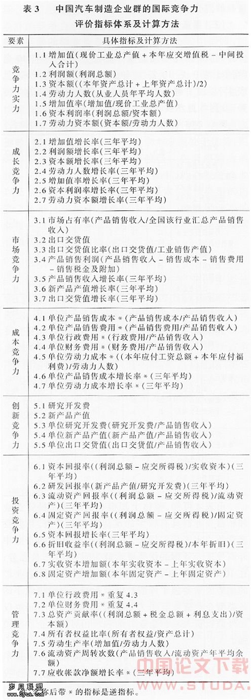 现阶段中国汽车制造企业群的国际竞争力评价体系分为7个竞争力要素:竞争力实力、成长竞争力、市场竞争力、成本竞争力、创新竞争力、投资竞争力及管理竞争力,采用48个指标(各要素下的具体指标及方法见表3)。