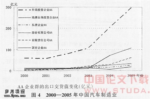 特大规模的外商投资企业群体的出口价值尤其体现出优势,密切关注和迅速拓展国外市场;2003年之前其他类型企业群几乎在同一水平,普遍低下,这两年拉开了差距,股份有限公司增长较快,而内资的私营企业和国有企业群体表现一般,然而这些类型企业群无论表现好与一般,与外商投资企业相比差距愈来愈大。