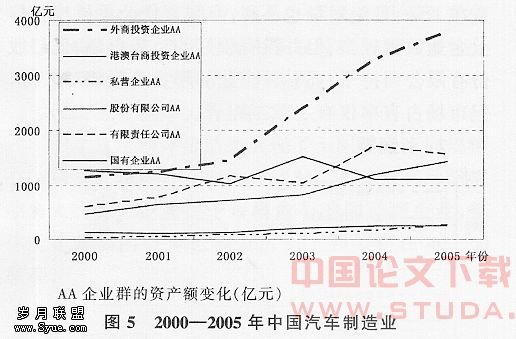 我国汽车制造企业群的利润额整体上在加入WTO之后的两三年一直在升温,是汽车行业盈利空间较大的时期,然而这些利润基本属于特大规模的外商投资企业群,这一群体利用自身的优势,抓住生产市场,占领消费市场,实现较大的盈利水平;目前,股份有限公司和有限责任公司企业群的利润额约是外商投资企业的1/6,其他类型的企业群的利润额更少。