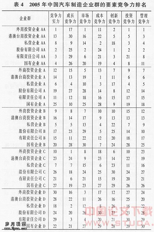 2.特大规模的内资型企业与相应的外商投资企业竞争力水平相比,差距较大,与世界汽车产业的先进国际竞争力更是相距甚远;但股份有限公司的综合竞争水平在内资企业中表现相对较好,这类内资企业群的要素竞争力结构现状与今后的走向趋势类似于外商投资企业,只是企业的成长和成本竞争力尤其处于劣势。但这类企业群在资产投入、新产品生产及扩大国内外市场等方面发展势头迅猛,它们不断地积累企业的实力,抓住发展企业的核心因素稳步地提升自身的竞争力。只是整体上现有的这种竞争机制企业群在汽车行业还相对较少,形成与发展的根基较弱,但它们前景较好,值得期待。同样其他规模的股份有限公司竞争力水平偏下。