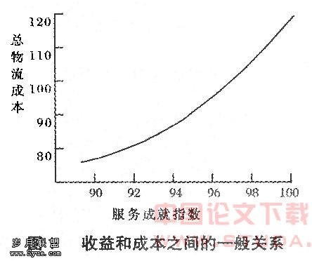 纵轴代表提供的可用的服务、绩效和可靠性的物流成本。横轴代表满足客户需要的百分比形式表示的服务成就。就收入产出而言,通常假设服务水平越高,收入会越大。一般的关系是这样的:当总的承诺趋向于零缺陷(100%)时,基本服务升级的成本就会以递增的费率增加。换句话说,改进总服务时,为获取继续增加的服务改进,将会花费更多。诸如,一个在98%的服务中的2%的服务改进费用将会比在88%的服务费用大得多。