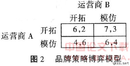此模型的占优均衡是运营商A开拓市场,运营商B选择模仿。即是说在博弈双方力量不对等的情况下,力量强的一方的正确策略是主动出击,力量弱的一方的正确策略是等待,搭强者的便车。因为在电信市场上,要根据用户的需要来细分市场,锁定目标用户,不仅要求有很强的市场开拓能力、雄厚的资金作保证,而且开拓市场存在一定的风险。比如,与动感地带同时推出的还有其他几个品牌,但真正让用户信赖的只有动感地带这一品牌。对中小运营商来说,与其与主导运营商在开拓市场方面火拼,还不如先观看主导运营商的行动,跟随主导运营商采取行动,或者等到主导运营商培育市场后,模仿主导运营商的竞争策略,推出类似的品牌,以政府允许的低价抢占和争取用户。对主导运营商来讲,他的占优战略是努力开拓市场,如果让中小运营商成功开拓市场,那么中小运营商结合其低价策略,可能就会抢占更多的市场份额。