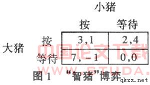 这时,大猪小猪得都有两个战略:按或等待。图1为“智猪”博弈的战略式表述。