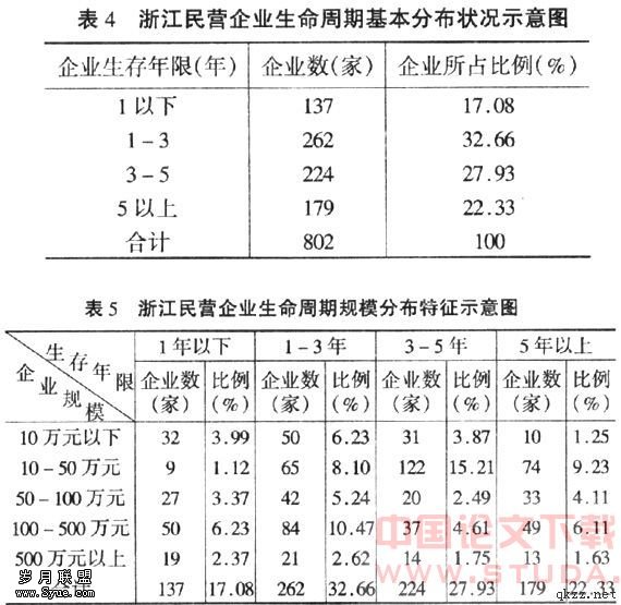 表4、表5是根据对全省802家企业抽样调查的统计分析,可以得出:浙江民营企业的平均寿命为3.44年,生命周期小于5年的占了77.67%。