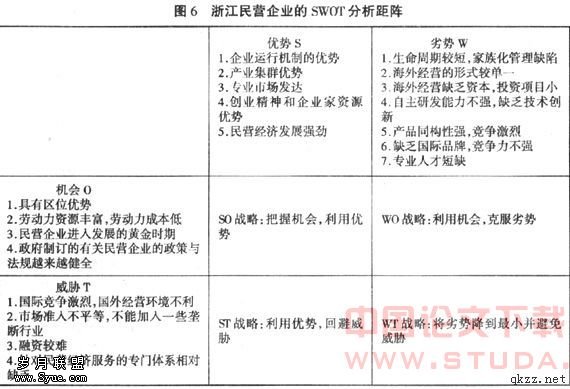 通过以上对浙江省民营企业海外经营SWOT距阵的分析可以得出相应的发展战略和对策。