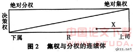 该图也同时表明,上司与下属的心理距离R影响着集权与分权的变动范围。当二者心理距离较小时,连续体的变动范围小,斜线的斜率较大,说明分权的变化幅度大,可以大胆授权;当二者心理距离较大时,连续体的变动范围大,斜线的斜率较小,说明对分权的变化幅度小,授权应较为慎重。