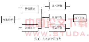方案评价是从许多创造的方案中筛选出一个可行的最佳方案,一般分为概略评价和详细评价。概略评价和详细评价都包括技术评价、评价、社会评价和综合评价,方案评价内容如图 2 所示。