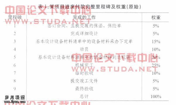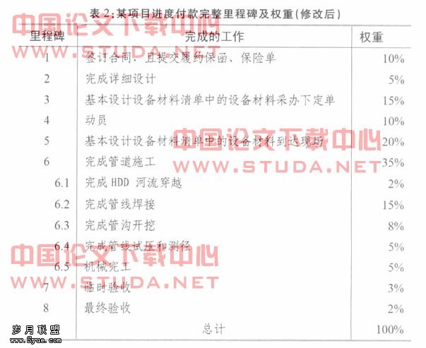 对于上述里程碑付款权重表,我们在合同谈判时提出的修改意见是提高前部分的比例。如1#项的预付款提高到10%;另一方面。细化每一项完整里程碑,使承包商获得较快的付款和好的现金流。形成比较合理的进度付款 完整里程碑。如下表(其中2#、3#、4#、5#项未将细化后的完整里程碑列出)。