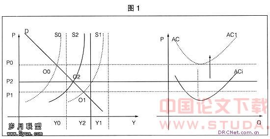 假定初始状态市场处于供需均衡状态,并不存在产能过剩,即所有行业内企业经济利润至少为零。这时,产品的供需曲线相交于O0点,此时均衡价格为P0,那么行业内所有企业的平均成本最小值至少不高于P0(如图1)。图1中,P代表价格,Y代表行业的最大生产能力,S代表产品供给曲线,D代表产品需求曲线,AC代表企业平均成本,Q代表企业产量。