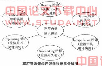 速录速记技能拆解为:“听写(在英语环境中,记录旅游专业词语拼写的速度与准确度)一听记(在英语听力环境中,记录旅游专业关键词或信号词的速度以及旅游信息的准确度)一听释(在英语听力环境中,记录旅游相关信息的速度与正确性以及诠释的对应性)一听译(在英语听力环境中,记录旅游相关信息的速度与准确性以及中文信息的对应性)一听打录(在英语听力环境中,机操作记录旅游相关信息的速度与准确性)一听读(在英语听力环境中,模仿导游讲解跟读的速度、准确性及效度)”实践课程从“叫座(如学生选修人数)+叫好(如学生技能实操测评效果)+叫市场(如学生就业率与岗位对应性)”起步。