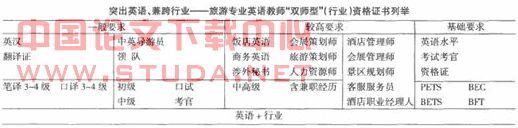 《国务院关于大力发展职业的决定》(2005.10)中指出:“大力推行:1学结合、校企合作的培养模式,与紧密联系,加强学生的生产实习和社会实践,改革以学校和课堂为中心的传统人才培养模式。”高职高专院校人才培养工作水平评估方案(教高厅[2004116号)非常鲜明地指出,即“建立”双师型“教师队伍;以培养技术应用能力为主线,设计教学方案,以应用为主旨构建课程和教学内容体系,加大课程改革的力度。”结合《关于进一步加强高等职业教育教学工作全面提高教学质量的意见》(京教高[2008]3号)及相关文件精神和文科高职院校及英语教师实际状况与特点,我们把实践和探索旅游专业英语教师“双师素质、双师型”队伍建设及其评测指标作为深化“产学研”工作内涵的切入点,把旅游专业英语课程体系的建设和旅游专业英语教学“产学研”模式的改革作为突破口,为有效提高旅游专业英语教学质量奠定基础。