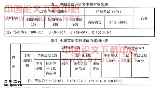 中职英语评价方案基本框架把对学生的学期英语学习等次评定建立在形成性评价和终结性评价上,其中形成性评价包括学时考勤和学习过程考核,过程考核又包含情感态度、完成作业和平时测试,形成性评价成绩占等次评定总成绩的40%;终结成绩占等次评定总成绩的60%。等次分段和其它项目所占比例详见下表1。