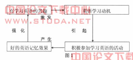 (1) 英语记忆的第一种方法就是引起动机——记忆的媒介。动机是激励人们去行动以达到一定目的的内在原因,是推动人们行动的内部动力。学习动机产生于学习需要,愿望和兴趣,兴趣所在,就是力量所在。记忆的最好动力就是对学习内容的兴趣。有关的研究表明,当你情绪激动时,会释放一种糖核酸(KNA)的分子激素,这种激素能支配大脑内蛋白质的合成,从而达到长时间记忆的效果。美国记忆专家伊斯布拉泽斯指出:“记忆与动力是成正比例增长的”,所以英语学习必须先明确学习动机,以达到保证调动起高涨的学习情绪之目的。学习动机可以从如下几方面获得:内部动机—来自对知识本身的向往和追求,来自追求成功,避免失败的愿望,来自好奇心理产生的探索、求知的欲望。外部动机来自于社会、学校、家庭,及未来生活和职业需求的压力,同学间的竞争和鼓励等。动机与英语记忆之间的关系是一种典型的相辅相成的关系,一种绝对的单向性关系。学生通过英语学习,逐步认识了它的作用和意义,体会到了“成功的喜悦”,尝到了学习 英语的甜头,从而对英语发生浓厚的兴趣,增强了学习英语的动机.图1说明了这种关系。