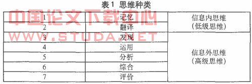Waters(2006)在“思维与语言学习”论文中并用实例说明了英语教学活动中体现的思维形式,他认为,不同的课堂任务会激发学生不同层次的思维活动,带来不同的学习效果。Waters采用了Sanders(1966)的思维分类方法以及Brunner(1973)的理论,将思维活动分成七种并归类为两大范畴(见表1)。