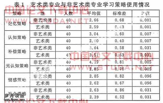 (2)艺术类专业与非艺术类专业在学习策略上的使用情况的异同。