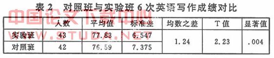 从表2写作成绩对比中不难发现,由于两个班采用不同的教学方法,实验班学生的写作成绩明显高于对照班,两者之间的差异达到统计显著性水平。本次实验数据证实了以写作元认知教学活动设计原则指导下的扩展过程写作法教学确实会影响学生的写作成绩,能帮助提高学生的写作水平。