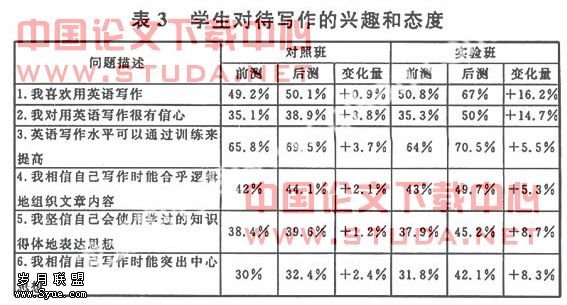 表3调查问卷中有6个关于学习用英语写作的兴趣和态度的问题,其中前3项属于一般的概括性问题,后3项涉及英语写作中的一些具体问题。统计结果显示,实验前后对照班的写作态度无明显变化,而实验班学生的学习态度却有了较为显著的变化。实验班的学生对英语写作的兴趣有明显提高,并且对英语写作更有自信了。