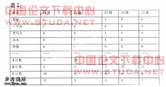 备课要有针对性,做到重点难点突出,就要对学生答题情况及试卷难易做出正确的分析。对学生的答题情况既要总体分析本班学生整体水平在年级中的位置,又要逐项分析学生各题的正确率,对大至每个大项目班级整体的得分情况,小至每个小题A,B,C,D四个选项所选的人数都应做出细致的分析。笔者就以2007-2008学年度本校上学期期末考试为例,对某班的试卷进行量化分析。本班人数38人,将学生每项的得分输入电脑,很快制作出表格,教师先利用excel的功能得出每小题的平均分、难度、标准差和方差,这样就对班级学生在哪个项目上还存在缺陷一目了然。下面笔者截取部分表格为例。 从表1不难看出:学生31题、35题和36题的准确率相对比较低,上课时必须重点讲评,而对于那些错误率低的题目(如32题)可以留到课后个别解决。然后再次利用excel制作表2,这次将每道题的选项输入电脑,很快就能出每题A,B,C,D四个选项的个数,从中我们可以看出学生错误的集中之处。