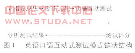 语言测试包括三大部分:目标能力、所测试的行为和测试结果。笔者尝试构建了一套可行的互动式测试模式,整个模式的实施应包括以下五个步骤:确立指导思想、设计试题、实施互动测试、进行测试评分和分析测试结果。这五个步骤形成一个链状结构(参见图1),环环相扣、互为条件、互为保障,紧密联系、缺一不可,确保整个口语测试模式的有效实施。