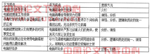 用这三条论据来支持反方的基本观点的过程便是演绎和分析在构思中的体现。最后结束陈述,强调电脑的消极影响是主要矛盾,而积极作用是次要矛盾,可以忽略不计,比如:电脑虽然可以在一定程度上促进人们工作效率的提高,但他对人们的健康的保持、素质的发展和工作的有条不紊都是有显著的阻碍的,所以电脑对人们而言的坏处多于好处。从各个缺点的分析到最后的总结,便是归纳和总结的思维方法。