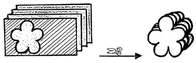 利用教具的直观效果,可以使教学内容具体化、形象化,而直观形象的事物最容易吸引小学生的无意注意力,这不仅节约了教师用语言解释的时间,也为学生感知、理解和记忆知识创造了条件。例如在教学“How many…can you see?I can see...”内容时,一般教师会准备些同类物品或画有同类物品的图片进行教学。但这样的情景设置对学生没多大吸引力,更缺少语言学习中非常重要的“信息沟”(Information Gap)。教师如果采用下面的教具,则会有意想不到的效果。教师准备好剪刀和一叠纸(图1),边剪边与学生交流:“What am I doing?Oh,I’m cutting. What am I cutting?I am cutting some flowers. How many flowers? Guess.”此时,教师再将一叠串起来的剪纸花,散开在学生眼前,让学生猜。这种方法,在教具的选择上,打破了事先准备好、课堂上简单出示一下的惯例,在教师边制作边交流的过程中,师生有一种思维、语言的互动,这种互动将英语学习变得真实、有趣、生动。如有可能的话,还可让学生将美术课学得的剪纸、绘画技术,在英语课堂上展示,动动手,画一画,剪一剪;动动口,伙伴间问一问,猜一猜。这样,根据具体的教学内容,真正将各学科有机地整合起来。