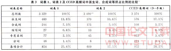 词表2采用了正表加附表的办法,总计词数超过3 500。正表收录3 393词,并用*号标出其中的895个八级词汇作为较高要求;附表包括数字、月份、星期共97个词条,以及56个国家名称及相关的国民和形容词。正表中派生词、合成词等所占比例明显低于词表1,即词根词的比例扩大,提高了词表的实际含词量。表3比较了《课标》的两个词表与CCED高频词中相关词类的收录比例,虽然CCED并非教学词表,但来自大型语料库的词频统计数据仍有很好的参考价值。与CCED高频词相比,词表1和2中的派生词量较小,而合成词量明显偏大。像crossroads,fingernail,greengrocer,hometown,housewife,housework,motorcycle之类语义自明的合成词,很容易掌握,可以不列入;但中小学生对词缀知识的认识很粗浅,所以派生词还是多收录为好。词表2的说明中列有“根据构词法推导”一项,不妨增加一个常用词缀附表,以扩大正表词汇的使用范围,体现词表的灵活性;或者也可从基础的低起点考虑,将常用的派生词列于词根词之后,但不单列词条,即把词目提升到“准词族”的水平,仍可收到相似的效果。表3词表1、词表2及CCED高频词中派生词、合成词等所占比例的比较*
