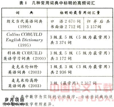 近十年来,大型语料库的建设已从千万词级到亿词级,为词典编纂提供了客观、可靠的依据。一些著名的英语词典都标明了3 000左右的高频词(表1)。显然,对这些最常用的词汇在基础英语教学中应予以优先地位和重点关注,3 000词的量可以考虑作为基础英语教学词汇的一个基数。