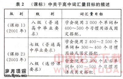 综上所述,一般高中生达到3 000~3 300总词汇量的要求是必要的,也是可行的。《课标1》把普通高中英语学科的词汇量目标设为3 000个;《课标2》又对这个目标作了分层细化,把必修课要求(即毕业要求,或称一般要求)和选修课要求(即大学入学要求,或称较高要求)分别设为2 400~2 500词和3 300词(表2),既照顾到各地区教学发展的不平衡和学生的个体差异,又保持了一定的先进性和前瞻性,较好地体现了一个纲领性文件对全国中小学英语教学的指导作用。