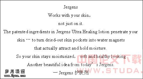从词汇层面上看,一个产品的广告将同一语域(register)的词汇集中在一起,运用各种词汇手段从不同的角度将相关的产品进行全方位的描述。例如,在服装广告里,经常出现的形容词有:soft,warm,lovely,fashionable,slim,washable,light,等等;而名词可能则有:clothes,clothing,garment,wardrobe apparel,outfit,costume,等等;食品类广告则会出现与食品的色、香、味以及食用健康相关的词汇,例如,形容词就有:tasty,delicious,nourishing,rich,wholesome,fresh,appetizing,abundant,等等;护肤品广告则会承诺让肌肤湿润、柔软、健康等等。请看以下一则护肤品广告的实例: