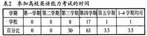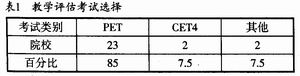 表1显示,85%的学校以高校英语能力考为教学评估考试,其中39%的学校还设有更高要求,即通过能力考试后,参加大学英语四级考试。7.5%的学校以大学英语四级为教学评估考试,另有7.5%的学校参加其他类型的考试,如剑桥商务英语(中级),及其他相关专业的外语考试。